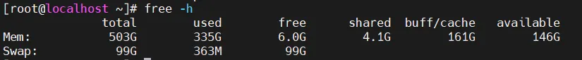 内存资源紧张会影响服务器响应速度,尤其对数据库、核心业务服务影响显著。核心命令free -h-h:表示以GB/MB等人类易读的单位展示数据,而非原始字节数。