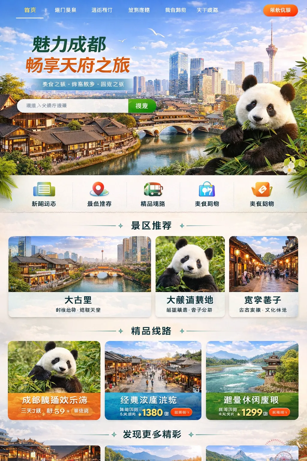 一个静态页面,图文并茂介绍成都主要景点(如锦里、宽窄巷子、大熊猫基地等)。