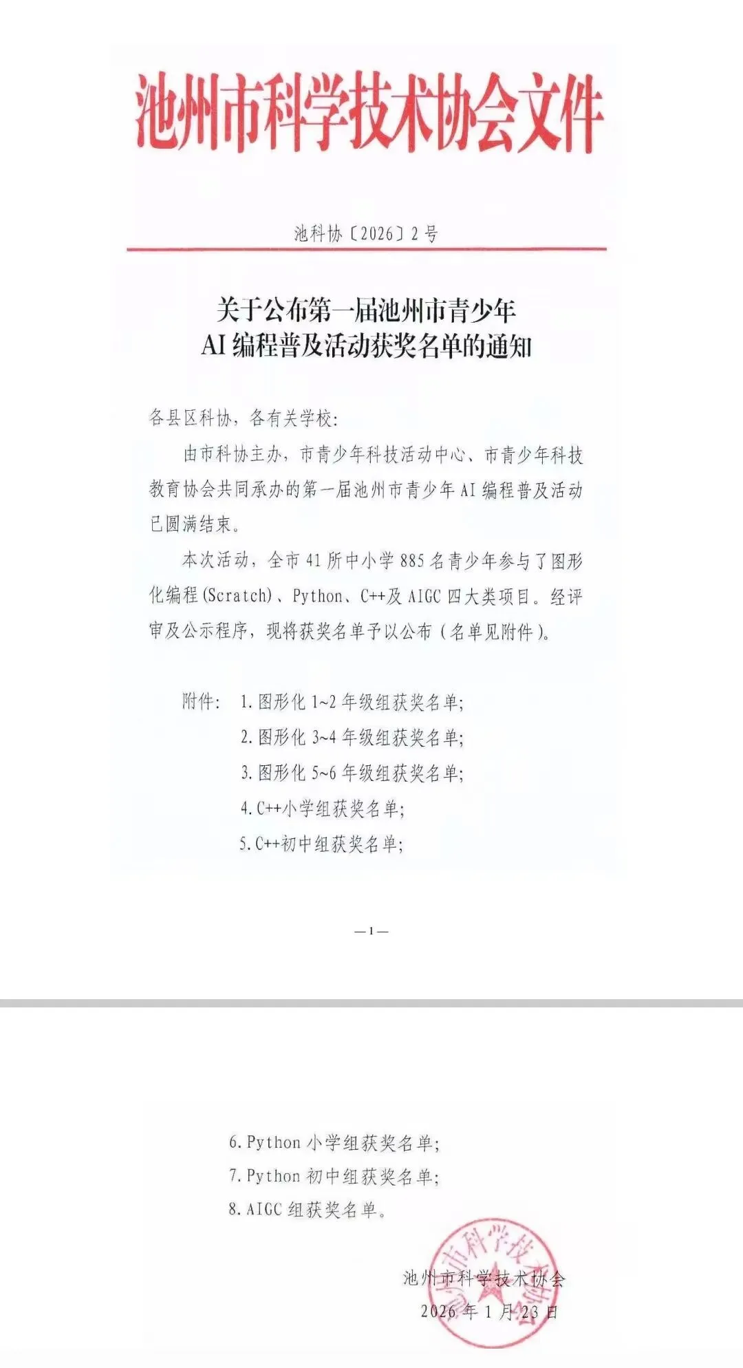 2026年1月10日,由池州市科学技术协会主办的首届池州市青少年AI编程普及活动圆满落幕。池州市第十中学的7名编程小将表现优异,他们在此次活动中展现了扎实的编程功底和创新算法思维,其中807班匡仙涵同学和808班董俊豪同学分别斩获初中组Python和C++项目的冠军。后期,两位选手将代表池州参加省级比赛。