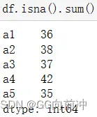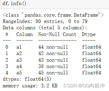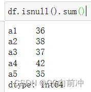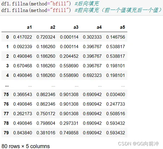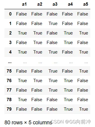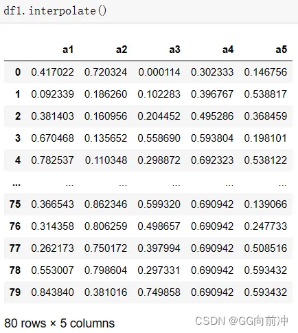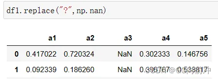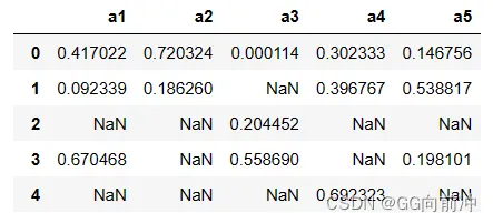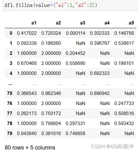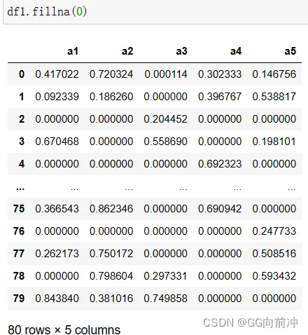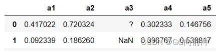 import numpy as npimport pandas as pdimport randomnp.random.seed(1) #随机种子data=np.random.rand(80,5)np.random.seed(11) m=np.random.choice([True,False],[80,5],(0.05,0.95)) #第一个表示取值,第二个表示个数,第三个表示概率m[0,2]=False #保持第一行为全数据,即第一行无缺失值data[m]=np.nandf= pd.DataFrame(data, columns=['a1', 'a2', 'a3','a4','a5'])生成80×5的数据集,其中缺失值为随机指定。