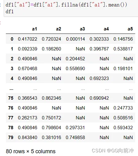 可以对缺失值填充聚合值,对于数值类型,可以填充如平均值、最大值等;如果是字符串,则可以选择众数。下面对a1列填充该列的均值: