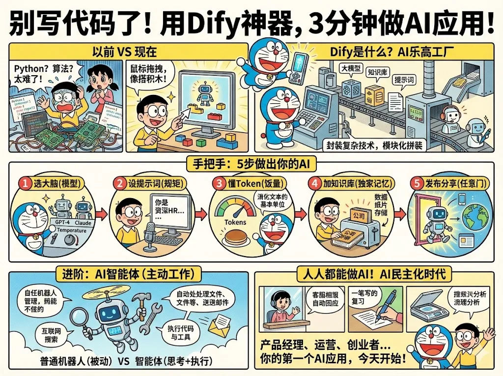 以前,AI应用开发是算法工程师的“专利”。现在,有了Dify这样的工具,产品经理、运营、销售、创业者,甚至完全不懂技术的人,都能把自己的想法变成AI应用。