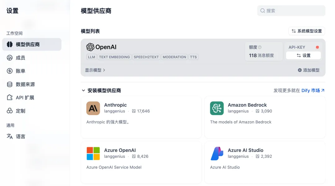 注册登录Dify后,点击“创建应用”。你会进入一个类似ChatGPT的对话界面。但别急,我们先要给AI选个“大脑”——也就是大模型(LLM)。