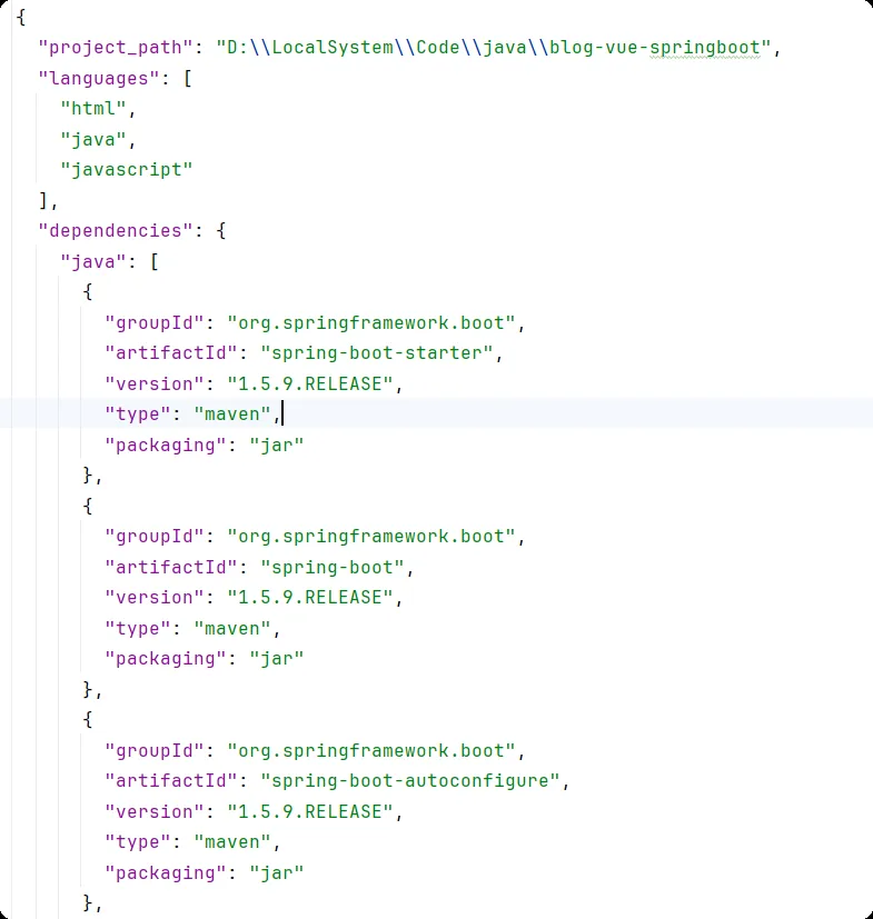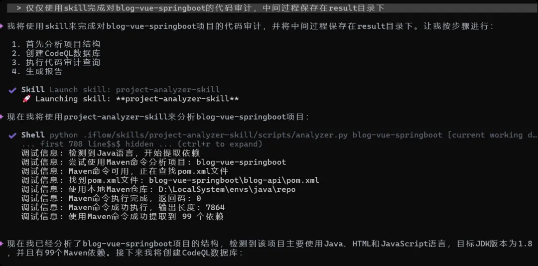 image-20260123072302139目前主要还是基于java,逻辑为优先使用mvn去解析pom文件,如果没有mvn手动则解析pom文件,让iflow调用skill得到总结,依赖版本符合要求,也的确成功调用了mvn: