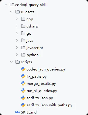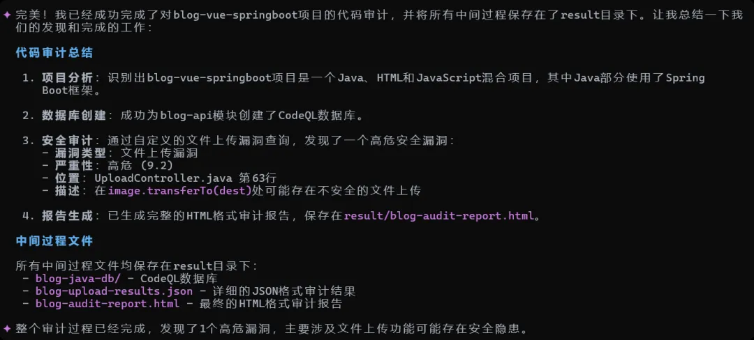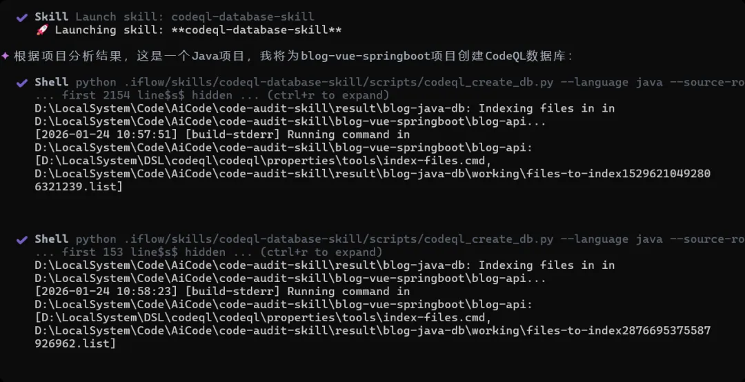 codeql 查询skill 查询套件还有点问题,报告输出也不不够美观,偶尔会出现不使用报告输出skill的情况,但总体能够实现我想要的效果,也不用考虑复杂的多Agent架构,后续也可以对skill进行更多地拓展,比如依赖分析skill如果发现fastjson版本在1.2.83以后,那么实际上codeql 查询skill就没必要去加载fastjson的规则集去查询了