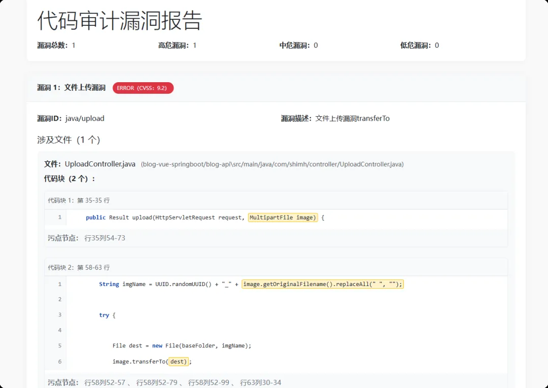 当收集完所有source-sink对的代码片段后,就可以让LLM基于提示词做污点分析,最后输出报告,这种思路实际上可以不用实现污点追踪。