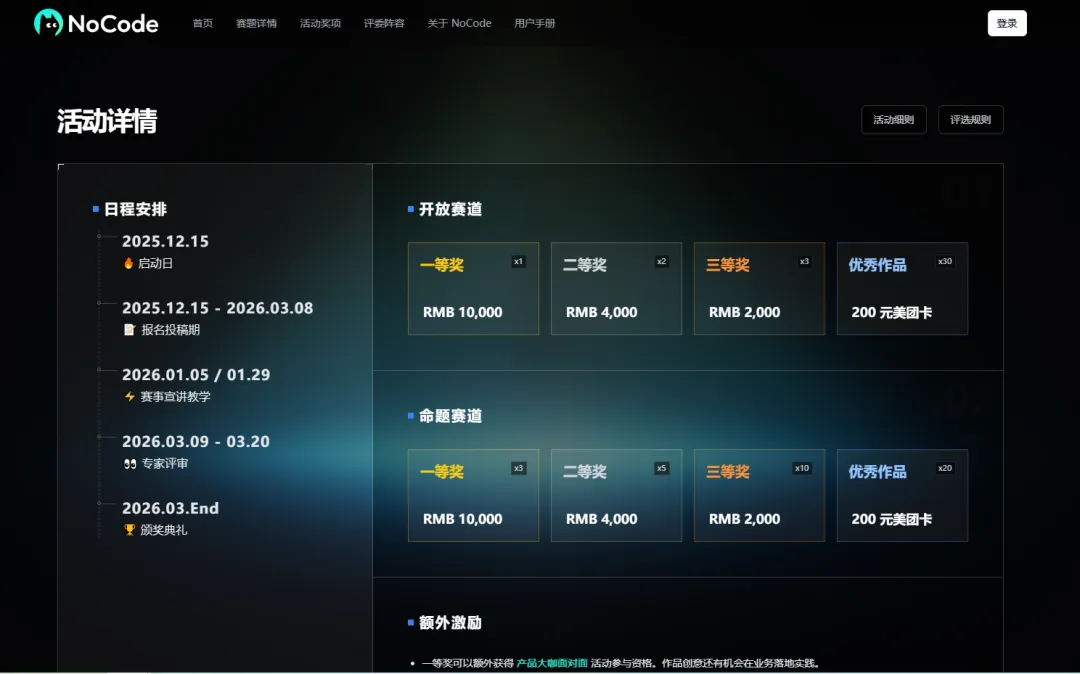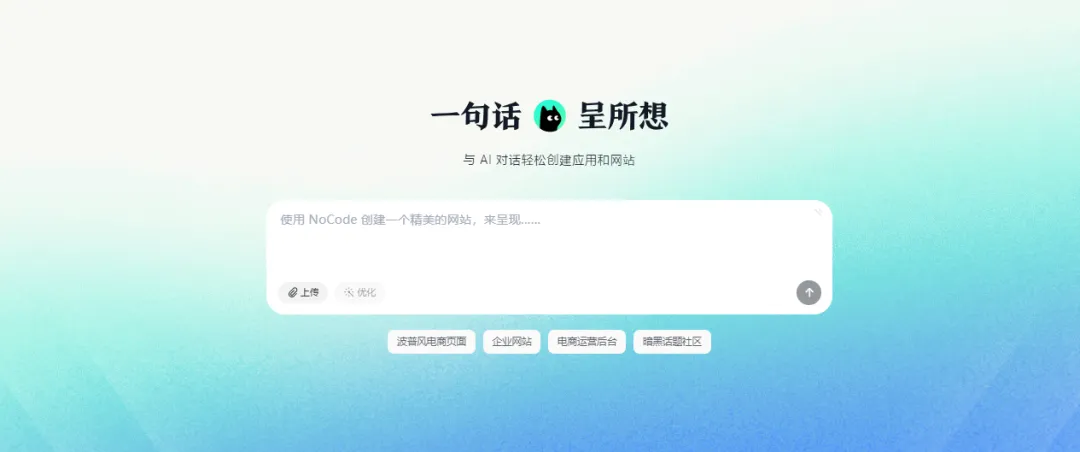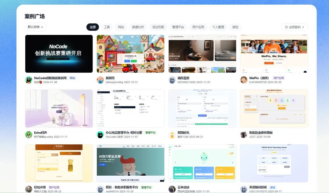 最近AI应用很火,大家都觉得AI的发展迎来了新一轮的浪潮。AI应用官方意思就是指利用人工智能技术解决实际场景问题的解决方案,其本质是通过数据驱动和算法模型替代或者增强人类在特定任务中的决策与执行能力。简单来说,就是可以用AI算法去参与到传统的产品制造、数据获取、服务等方面中,用AI算法去解放人类劳动力,提高工作效率,而且这效率不是一点半点。在这场浪潮中,很多AI工具应运而生,你可以看到有各行各业领域的AI工具开始出现在人们眼前,且那些工具的能力大到超乎人们想象。有一键生成H5广告图片的AI工具替代大部分的广告外包业务的、这些AI工具会让有些人失业没了工作,但也再不断的催生新的就业岗位、就业方向。有人用AI提高自己的工作效率,在以往一天的工作量半天就可以搞定。现在都专门有一个AI工具集,有AI写作工具,里面各式各样的AI工具,有学术论文的、有写小说的、有写诗歌、有写英文的等等。还有AI图像工具、AI视频工具、AI办公工具、AI智能体、AI聊天助手、AI编程工具、AI设计工具、等等。未来的AI发展方向一定是百花齐放的场面,只有铁打的平台,流水的创作者,源源不断的为大众输送应用,直到你的爆款出现。现在大厂都在卷AI,抢人才,不断投入资金搞AI,但他们搞的无一例外都是平台,搭接一个为创作者创作的平台。而今天要介绍的,就是美团进军AI所打造的一个平台——AI Coding Agent——Nocode。ncode是一个零代码应用生成平台,可以生成工具、网站、数据分析工具、活动页面、管理平台、用户应用、游戏等等。只需要文字描述你对于一个AI工具、AI应用的要求,他就可以给你呈现出来,再通过不断的让它完善修改,直到达到你的要求为止。全程不需要代码输入,nocode会自动输写代码,修改代码,直到代码跑动,可以渲染出产品页面。有对AI应用感兴趣、又不懂代码的朋友可以去尝试一下,从简单的小产品弄起,你会发现有不一样的AI思路方向。而且美团最近在推广nocode阶段,正在举办创新挑战赛,有对应的客服助手给你答疑解惑,也正是小白学习的好机会,在不断创作中成长,让自己在AI的赛道上更充实一点。在AI初入大众视野的时候,大家担忧AI的快速发展会影响自己的就业,而很少有人会尝试掌握AI。一方面是大家觉得AI方面的市场很难融入,另一方面是对AI背后的代码数据一窍不通。所以对于AI的认知只是在于AI搜索信息,AI智能科技给我们带来的便利。而随着AI应用所带来的商业变现,大批量AI工具、大厂AI创作平台的出现,让越来越多人发现了AI的价值,开始主动去抓住AI所带来的新机遇。