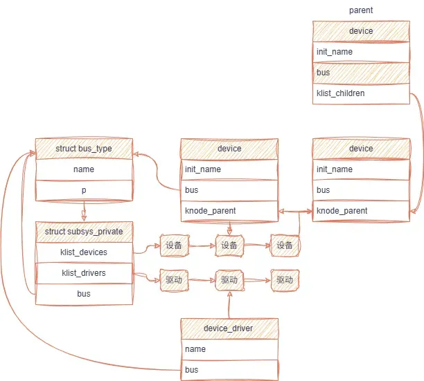 struct device {struct device *parent;struct device_private *p;struct kobject kobj; const char *init_name; /* dev名字e */ conststruct device_type *type;struct bus_type *bus; /* 指向所属bus */struct klist_node knode_class; /* 作为class成员时使用的链表节点 */struct class *class};struct device_private {struct klist klist_children; /* 链接children devic的链表头节点 */struct klist_node knode_parent; /* 链接到parent的链接节点 */struct klist_node knode_driver; /* 链接到绑定驱动的链表节点 */struct klist_node knode_bus; /* 用于挂到其所属bus的klist_devices链表中 */struct device *device;}