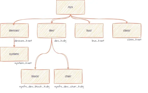 /** * driver_init: * ├── devices_init * ├── buses_init * └── classes_init*/int __init devices_init(void){ /* /sys/devices */ devices_kset = kset_create_and_add("devices", &device_uevent_ops, NULL); /* /sys/dev */ dev_kobj = kobject_create_and_add("dev", NULL); /* /sys/dev/block */ sysfs_dev_block_kobj = kobject_create_and_add("block", dev_kobj); /* /sys/dev/char */ sysfs_dev_char_kobj = kobject_create_and_add("char", dev_kobj);}int __init buses_init(void){ /* /sys/bus */ bus_kset = kset_create_and_add("bus", &bus_uevent_ops, NULL); /* /sys/devices/system */ system_kset = kset_create_and_add("system", NULL, &devices_kset->kobj);}int __init classes_init(void){ /* /sys/class */ class_kset = kset_create_and_add("class", NULL, NULL);}