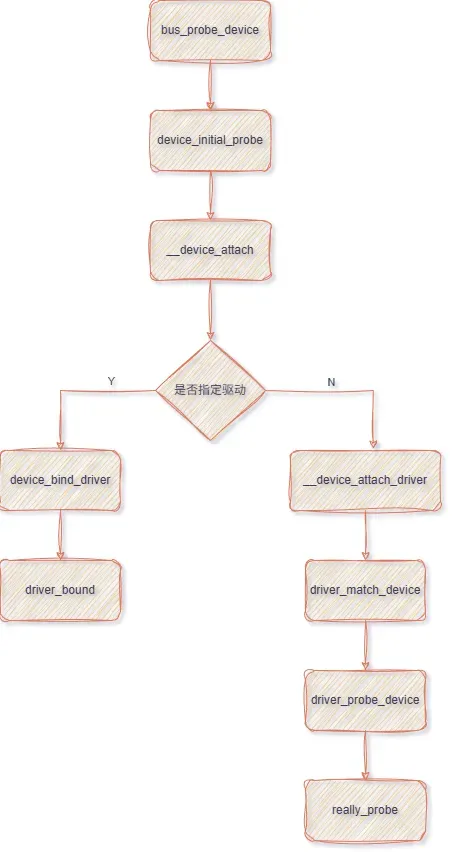 当添加设备时,会通过bus总线去探测驱动,如果设备指定了驱动,那么直接和它绑定;如果设备未指定驱动,那么遍历驱动链表查找,如果找到则调用probe函数执行。