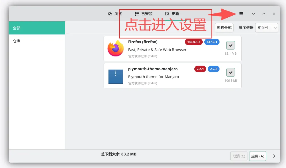 在安装软件之前,先对软件管理进行必要的设置,点击右上角的三横的图标,进入相关设置。