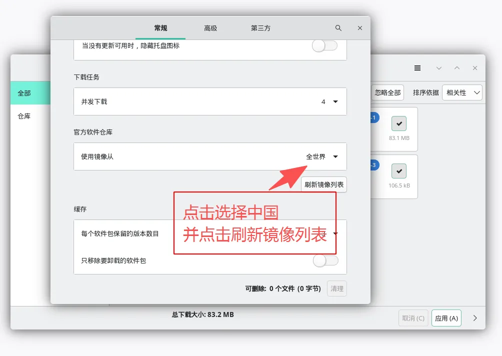 在“常规”标签页中的“官方软件仓库”设置中国镜像,下载速度大幅度提升,方便后期的软件安装,让我们少等很多时间。点“全世界”这里,从列表中选择“中国(china)”。选择后,一定要记得点击“刷新镜像列表”。