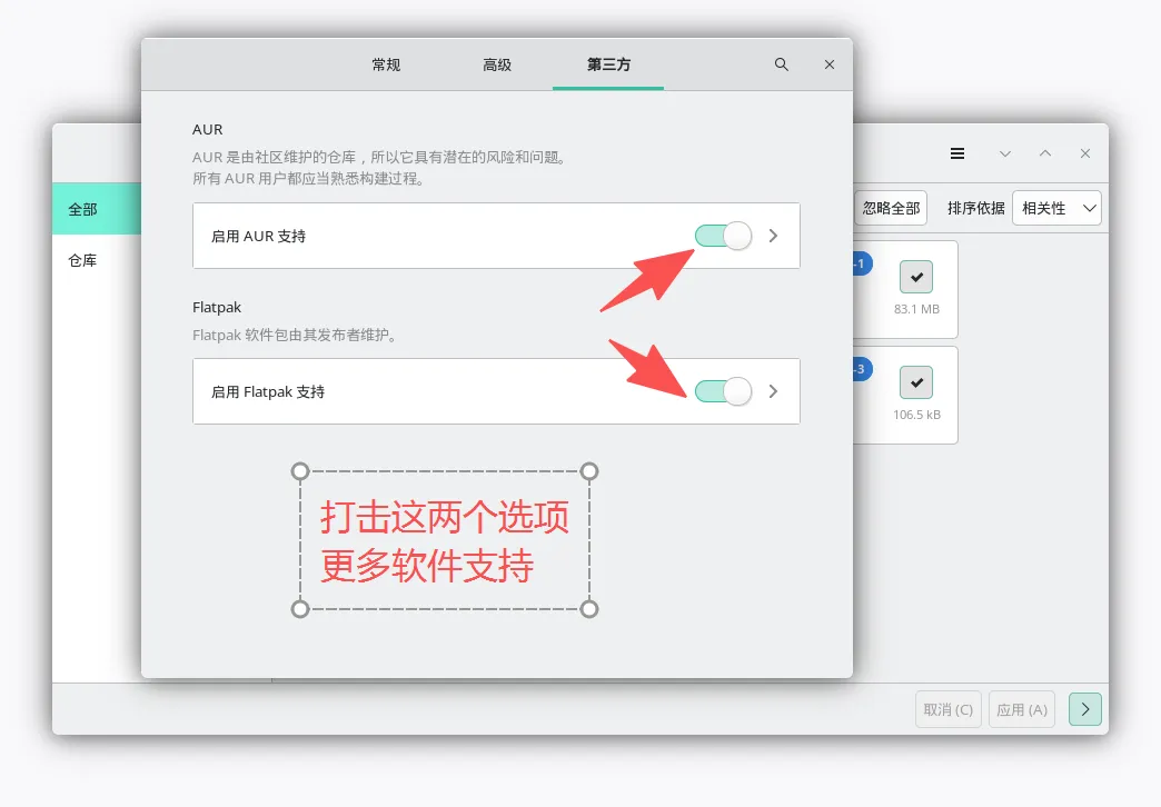 接着,点击“第三方”标签,在标签页打开“启用AUR支持”和“启用Flatpak支持”,这将为我们提供更多的软件支持。