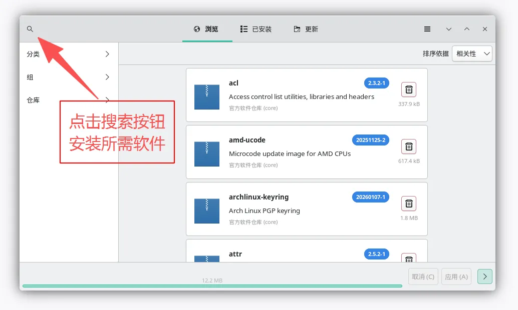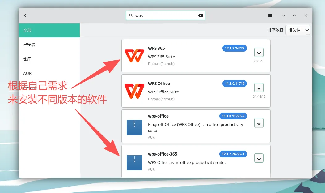 要安装WPS、微信,直接到软件管理的搜索框中输入要安装的软件,选择并应用,系统会自行安装。一般会有两种类型的软件可供选择,一是aur仓库的,二是flatpak。