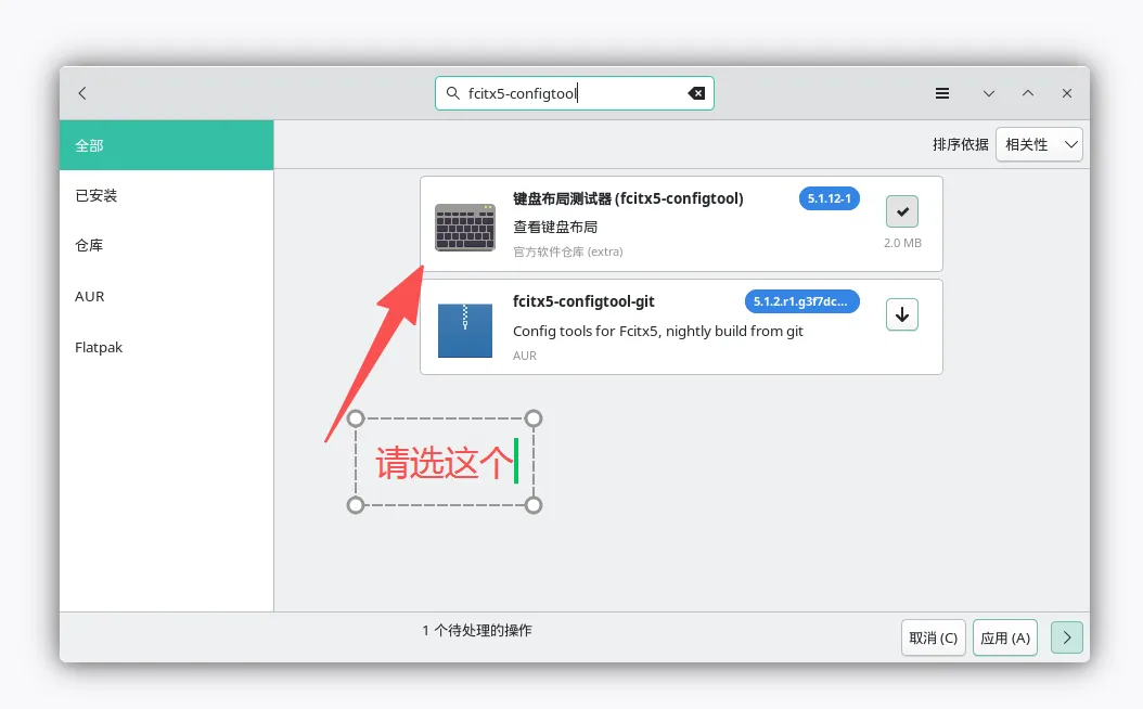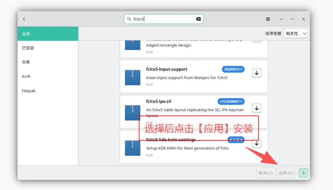 在搜索框中输入fcitx5、fcitx5-configtool、fcitx5-chinese-addons、fcitx5-rime,点击带向下箭头的按钮选择,再点右下角的“应用”就可以,有什么依赖,系统都会自动处理,或者提示用户进行选择。