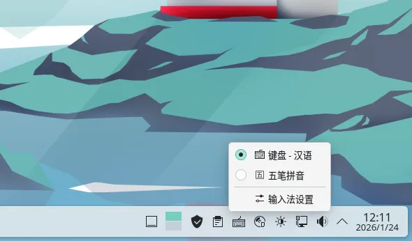 重启后,右下角就有键盘的图标了,可以单击右键配置输入法了,我是使用五笔输入法的,因此,选择了五笔拼音输入法。