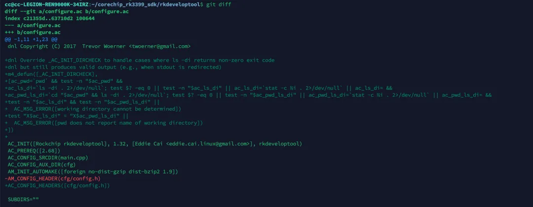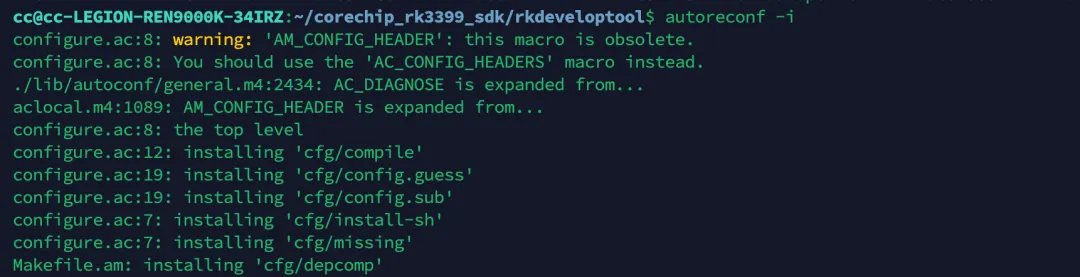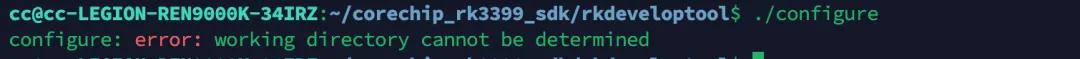 cc@cc-LEGION-REN9000K-34IRZ:~/corechip_rk3399_sdk/rkdeveloptool$ git diffdiff --git a/configure.ac b/configure.acindex c21355d..63710d2 100644--- a/configure.ac+++ b/configure.ac@@ -1,11 +1,23 @@ dnl Copyright (C) 2017 Trevor Woerner <twoerner@gmail.com>+dnl Override _AC_INIT_DIRCHECK to handle cases where ls -di returns non-zero exit code+dnl but still produces valid output (e.g., when stdout is redirected)+m4_defun([_AC_INIT_DIRCHECK],+[ac_pwd=`pwd` && test -n "$ac_pwd" &&+ac_ls_di=`ls -di . 2>/dev/null`; test $? -eq 0 || test -n "$ac_ls_di" || ac_ls_di=`stat -c %i . 2>/dev/null` || ac_ls_di= &&+ac_pwd_ls_di=`cd "$ac_pwd" && ls -di . 2>/dev/null`; test $? -eq 0 || test -n "$ac_pwd_ls_di" || ac_pwd_ls_di=`stat -c %i . 2>/dev/null` || ac_pwd_ls_di= &&+test -n "$ac_ls_di" && test -n "$ac_pwd_ls_di" ||+ AC_MSG_ERROR([working directory cannot be determined])+test "X$ac_ls_di" = "X$ac_pwd_ls_di" ||+ AC_MSG_ERROR([pwd does not report name of working directory])+])+ AC_INIT([Rockchip rkdeveloptool], 1.32, [Eddie Cai <eddie.cai.linux@gmail.com>], rkdeveloptool) AC_PREREQ([2.68]) AC_CONFIG_SRCDIR(main.cpp) AC_CONFIG_AUX_DIR(cfg) AM_INIT_AUTOMAKE([foreign no-dist-gzip dist-bzip2 1.9])-AM_CONFIG_HEADER(cfg/config.h)+AC_CONFIG_HEADERS([cfg/config.h]) SUBDIRS=""修改完后,删除刚才生成的configure,再执行一遍autoreconf -i或autogen.sh重新生成configure,再次执行即可完成配置: