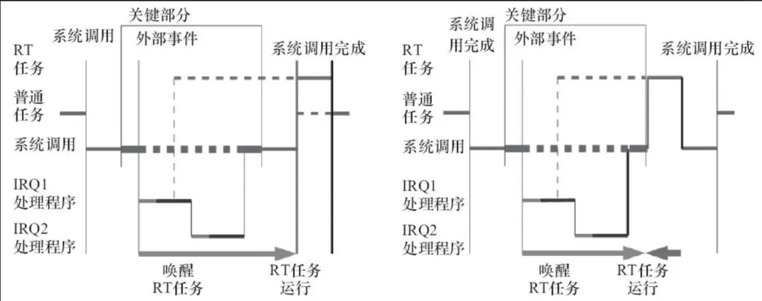 下图清晰展示了2.4与2.6后内核在抢占机制上的差异:2.4内核中RT任务需等待普通任务系统调用完成才能切入,而2.6内核可在普通任务释放自旋锁等关键资源后立即调度RT任务执行。