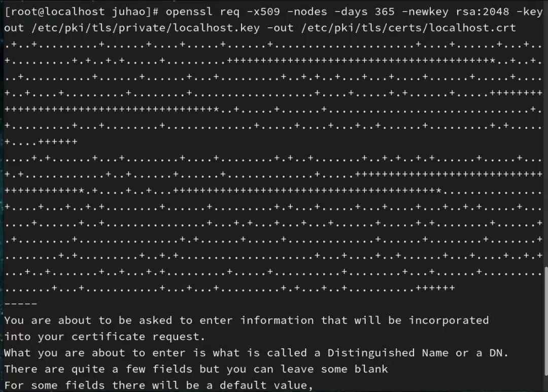 openssl req -x509 -nodes -days 365 -newkey rsa:2048 -keyout /etc/pki/tls/private/localhost.key -out /etc/pki/tls/certs/localhost.crt