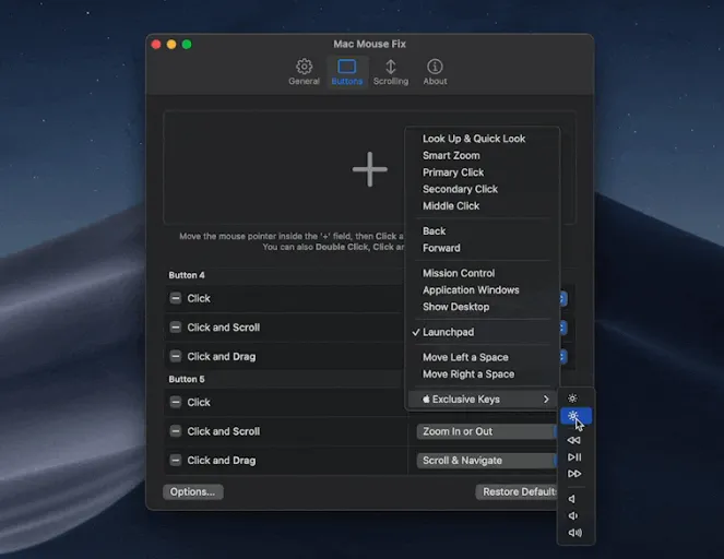 更香的是手势那一块。Mac Mouse Fix 支持自定义按键映射,你可以把鼠标的侧键、中键全利用起来。比如按住侧键再滚动,就变成桌面切换;按住中键往上拖,是多任务视图;往下拖变成显示桌面……习惯之后,那就是一个“穷人版妙控板”,左手键盘、右手鼠标,切应用和切桌面飞快。