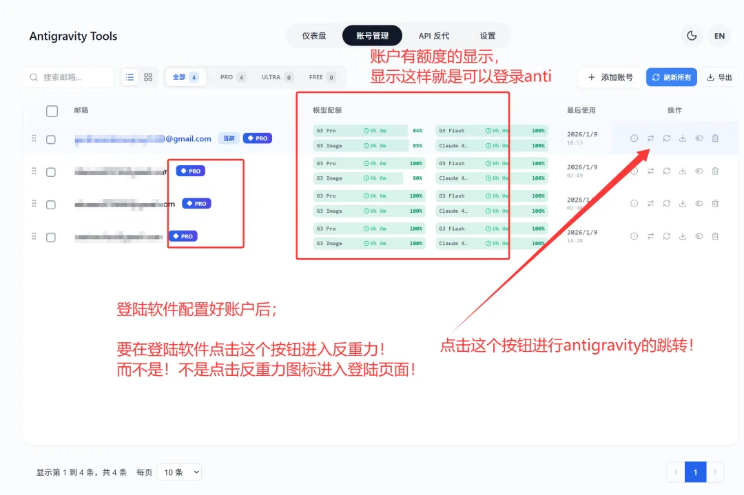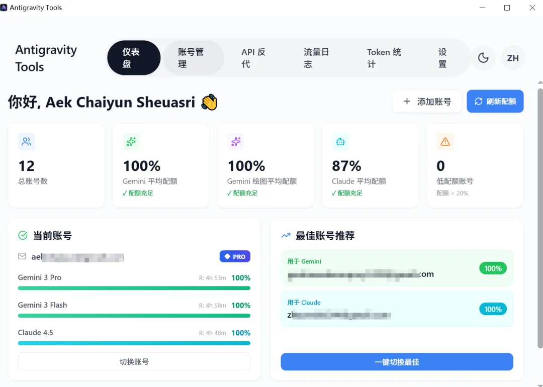 安装后打开 Antigravity Tools,点击 OAuth 认证登录,浏览器会自动跳转到 Google 授权页面。完成授权后,工具面板会显示你的账户信息,表示登录成功!:登录成功后会面板显示账户信息.png (Alt: 登录成功)⚙️ 第三步:从 Tools 切入 IDE