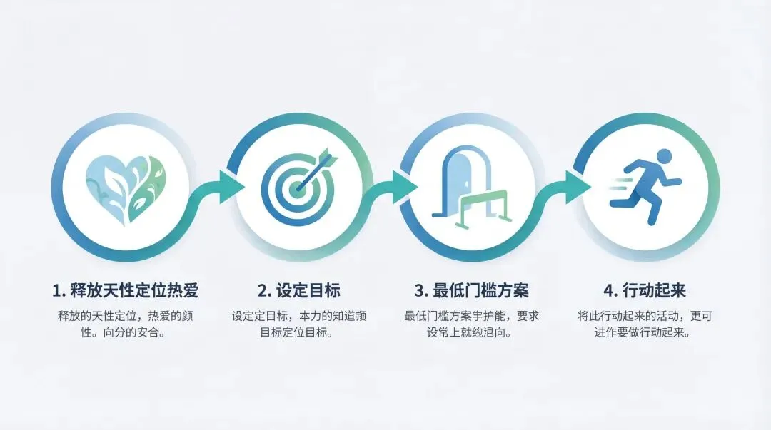 释放天性定位自己的热爱,设定目标,找一个最低门槛的方案,行动起来。