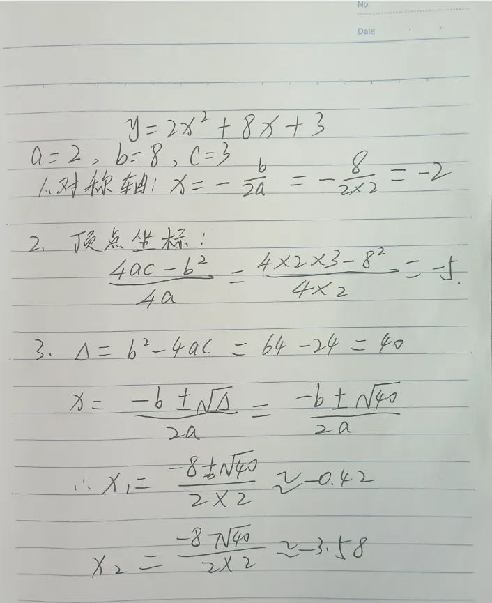 运行程序,分别输入系数a=2,b=8,c=3,点击计算按钮,就可以得到对应二次函数y=2x^2+8x+3的对称轴、顶点坐标、实根,结果如下图。小编亲自动手计算了一遍,发现程序运行的结果完全正确。到此,今天我们应用VB编程求解二次函数的问题就完成了。后面我们会在今天讲解的基础上,实现动态生成二次函数图像,更加直观的学习掌握二次函数。如果你在学习VB编程的过程中或者日常工作中有遇到程序问题,可以在文章下发留言,小编将会耐心解答。跟我学VB编程研发中心