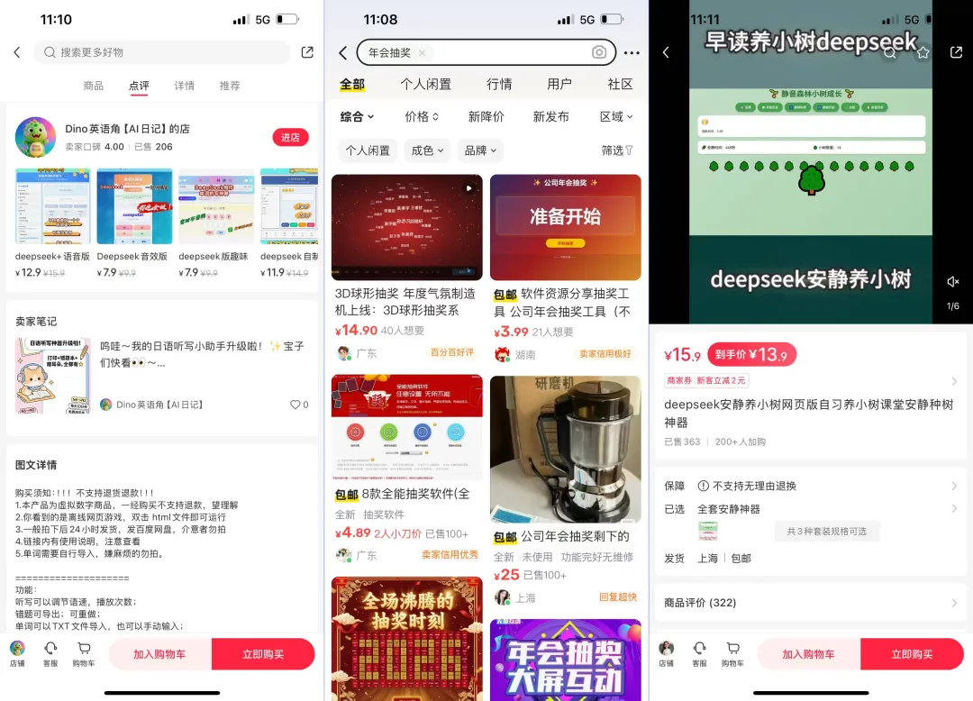 譬如,用AI编程完成一个年会抽奖的,咸鱼和小红书9.9-20元1个,都能卖上百件。