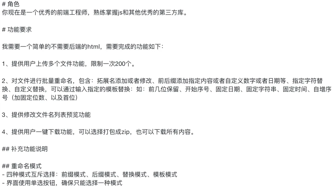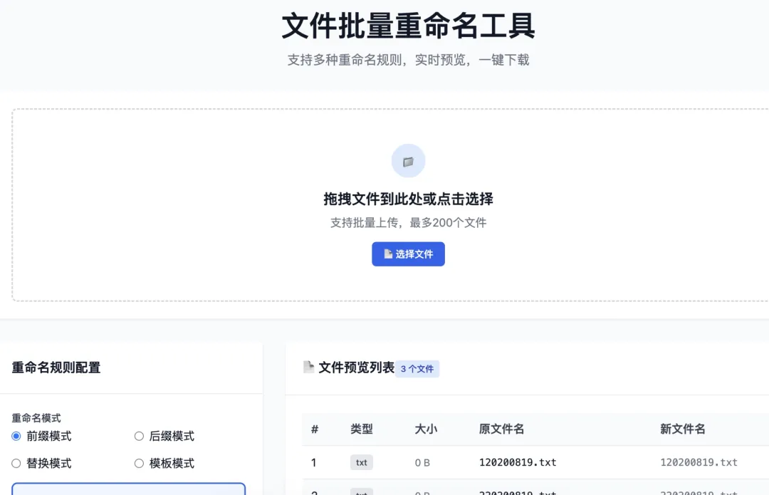 用静态页面做一个“批量重命名器”,10分钟搞定。支持规则命名+预览,做资料归档的人会爱死