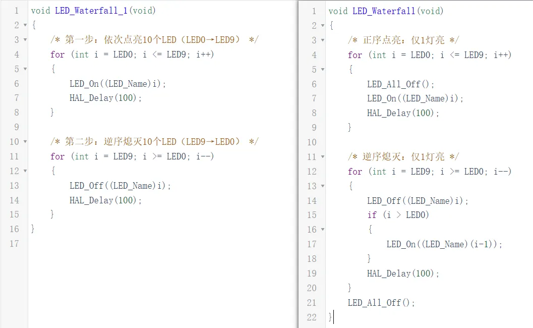 /* 根据当前模式执行对应流水灯函数 */switch(current_mode){case MODE_WATERFALL_1:LED_Waterfall_1();break;case MODE_WATERFALL_SINGLE:LED_Waterfall();break;case MODE_WATERFALL_GROUP:LED_Waterfall_Group();break;default:current_mode = MODE_WATERFALL_1; // 异常时默认模式1break;}