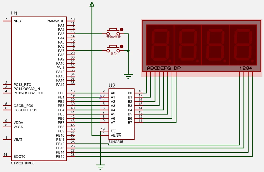 本例子使用硬件定时器实现精确计时(每100ms计数一次,计时精度为0.1s),使用4位数码管(动态扫描算法)实现秒表功能,通过按键控制秒表启停和复位。通过简单的例子学习硬件定时器计时功能使用(定时中断)、继续使用GPIO中断实现两个按键检测。