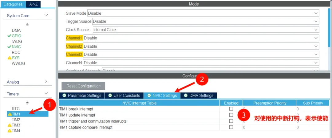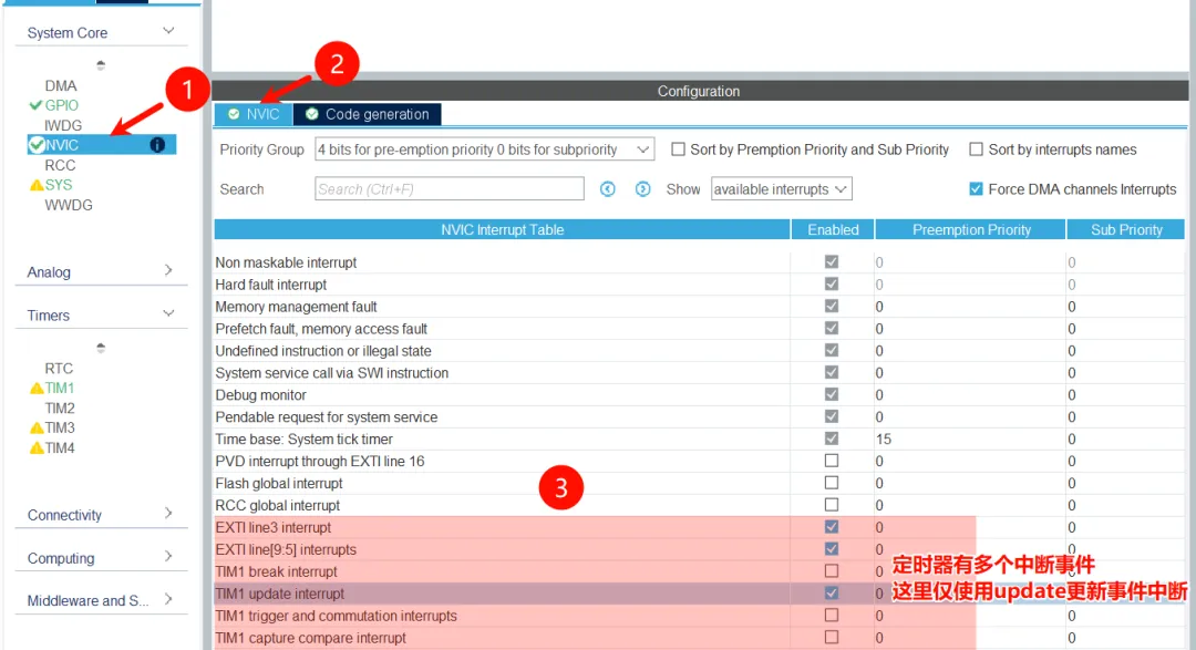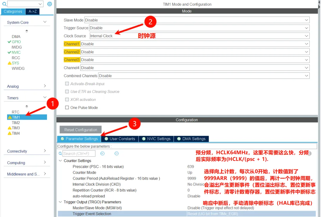 STM32F103 定时器的分类与核心功能STM32F103 的定时器主要分为三类:基本定时器(TIM6/TIM7)、通用定时器(TIM2-TIM5)、高级定时器(TIM1/TIM8),不同类型的功能由简到繁,具体如下:基本定时器(TIM6/TIM7)仅具备最基础的定时功能,无 IO 输出 / 输入通道,核心功能:基本定时 / 计数:通过内部时钟(72MHz 分频后)实现精准的时间基准,溢出时产生中断或 DMA 请求。DAC 触发:可作为 DAC(数模转换)的触发源,用于同步 DAC 的输出更新。典型应用:基础延时、DAC 同步触发、系统心跳定时器。通用定时器(TIM2-TIM5)功能最丰富、使用最广泛的定时器,支持输入 / 输出通道,核心功能:(1)核心定时 / 计数模式向上计数:从 0 计数到自动重装值(ARR),溢出后重置为 0 并产生更新事件。向下计数:从自动重装值计数到 0,溢出后重置为 ARR 并产生更新事件。中心对齐计数:先向上计数到 ARR,再向下计数到 0,双向循环(适合对称 PWM)。(2)输入捕获检测外部 IO 引脚的电平变化(上升沿 / 下降沿),记录定时器当前计数值,实现:测量脉冲宽度(如超声波测距的高电平时长)。测量信号频率(如编码器脉冲计数)。捕获外部触发信号的时间戳。(3)输出比较将定时器计数值与预设的比较值(CCR)对比,满足条件时控制 IO 引脚输出:输出电平翻转(如产生固定频率的方波)。输出单脉冲(触发单次外部事件)。强制置位 / 复位输出引脚。(4)PWM 生成通过输出比较的 PWM 模式,生成占空比可调的脉冲宽度调制波:边缘对齐 PWM(常用,如电机调速、LED 调光)。中心对齐 PWM(适合高精度电机控制)。(5)编码器接口对接增量式编码器,自动计数编码器的 A/B 相脉冲,实现:电机转速 / 位置检测。旋转编码器的脉冲计数。(6)外部触发同步可通过外部 IO 引脚的信号触发定时器启动 / 停止 / 重置,或同步多个定时器的计数。高级定时器(TIM1/TIM8)在通用定时器基础上增加了 “死区生成” 和 “刹车功能”,专为电机控制设计:通用定时器的所有功能(定时、PWM、输入捕获、编码器等)。互补 PWM 输出:每路 PWM 对应一路互补 PWM,可设置死区时间(防止电机桥臂直通)。刹车 / 断路功能:检测到故障信号(如过流、过压)时,立即关闭 PWM 输出,保障硬件安全。支持多通道 PWM 同步输出(适合三相电机控制)。