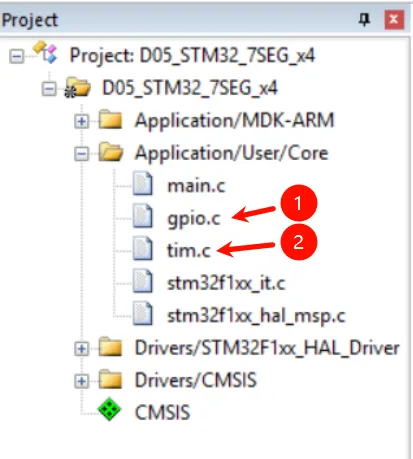 使用stm32f103c8实现4位共阴数码管计时器:1)有两个按键,连接到PA3和PA7,PA3为开始/结束按键,PA7为复位按键,使用中断方式读取按键输入;2)数码管使用4为共阴数码管,PB0~PB6连接数码管a~g段,PB7连接dp(小数点);PB12~PB15分别连接4位数码管的位选信号,顺序从左到右。3)使用定时器1定时中断进行精确计时;4)使用HAL库已完成按键、数码管使用GPIO的初始化和定时器的初始化;5)开始运行后,计时器不工作,计数值为0,数码管显示0000;此时按下复位键无效6)按下开始按键,启动定时器计数;计数过程中按下复位键无效;计数过程中,再次按下开始键,停止计数,数码管显示最后的计数值;这时按下复位键,计数清零,显示0000。再次按下开始后,重新开始计时...;7)在定时中断中进行计数(定时器初始化中每隔100ms中断一次)累加,当大于9999(4为数码管最大值)后,自动停止计数;定义数码管动态扫描函数,在主循环中调用,实时显示计数值9)因为已经完成时钟、按键、数码管、定时器硬件初始化,只需要实现功能代码和gpio中断回调函数和定时中断回调函数即可。10)所有函数和变量定义都在main.c中完成。
