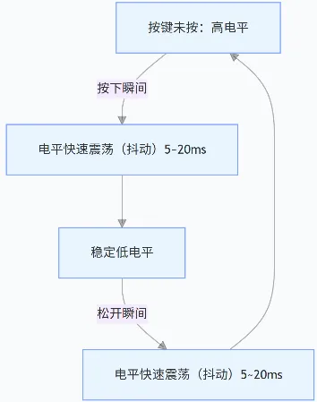 简单来说,按键消抖是为了避免机械按键物理特性导致的 “虚假触发”,让单片机只识别一次真实的按键操作。一、按键抖动的本质:机械触点的物理特性普通的机械按键内部是金属触点,按下 / 松开时,触点不会瞬间接触 / 断开,而是会因为弹性产生快速、多次的通断震荡(也就是 “抖动”),这个过程持续约5~20ms。用通俗的方式理解:理想状态:按下按键 → 触点 1 次闭合 → 松开 → 触点 1 次断开;实际状态:按下按键 → 触点 “闭合 - 断开 - 闭合 - 断开” 震荡(5~20ms)→ 稳定闭合 → 松开 → 同样震荡 → 稳定断开。