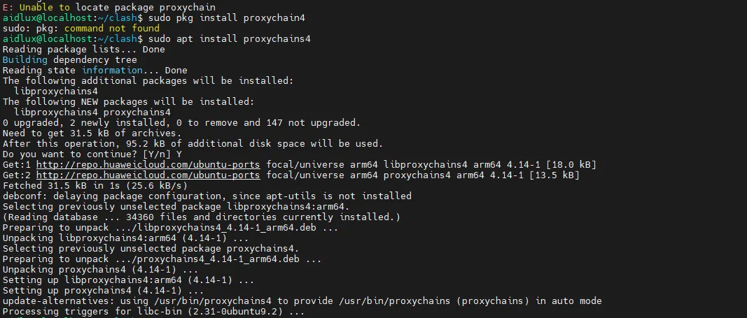 # 先更新源,避免安装失败sudo apt update -y# 安装proxychains4(亲测pkg安装失败,直接用apt)sudo apt install -y proxychains4