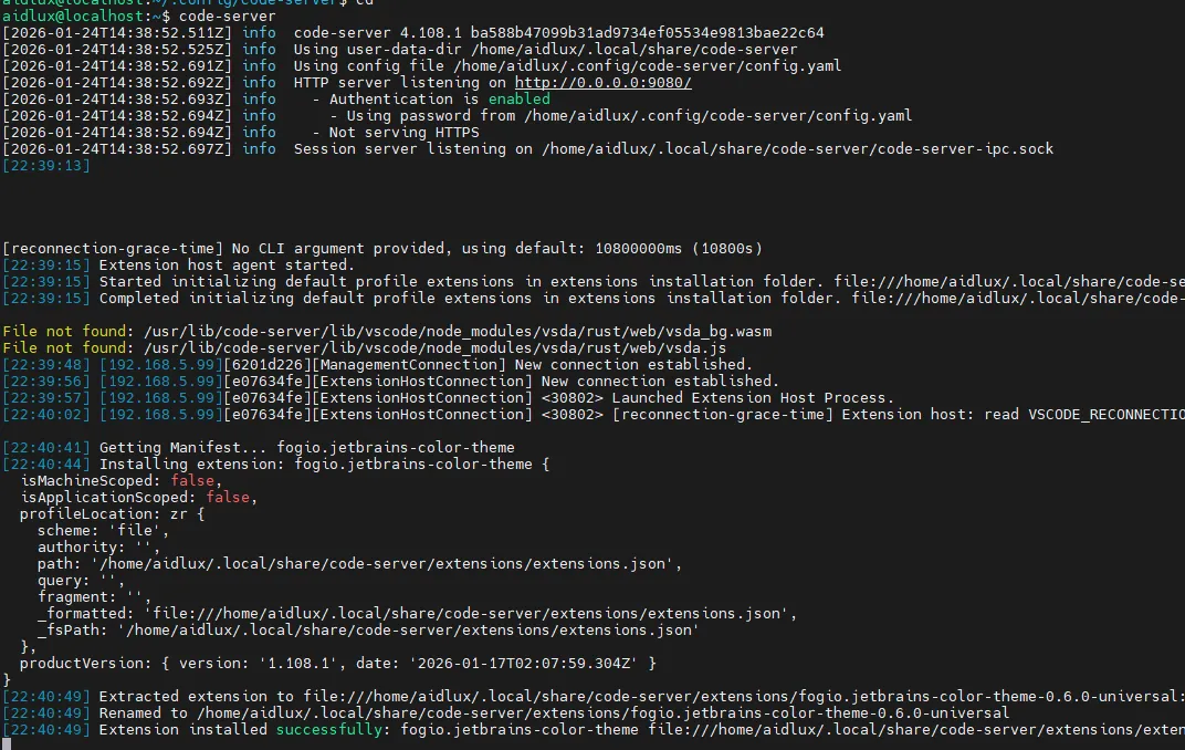 # 前台启动(看日志,测试用,关闭终端即停止)code-server# 后台启动(生产用,终端关闭不影响,推荐)nohup code-server --bind-addr 0.0.0.0:9080 > code-server.log 2>&1 &