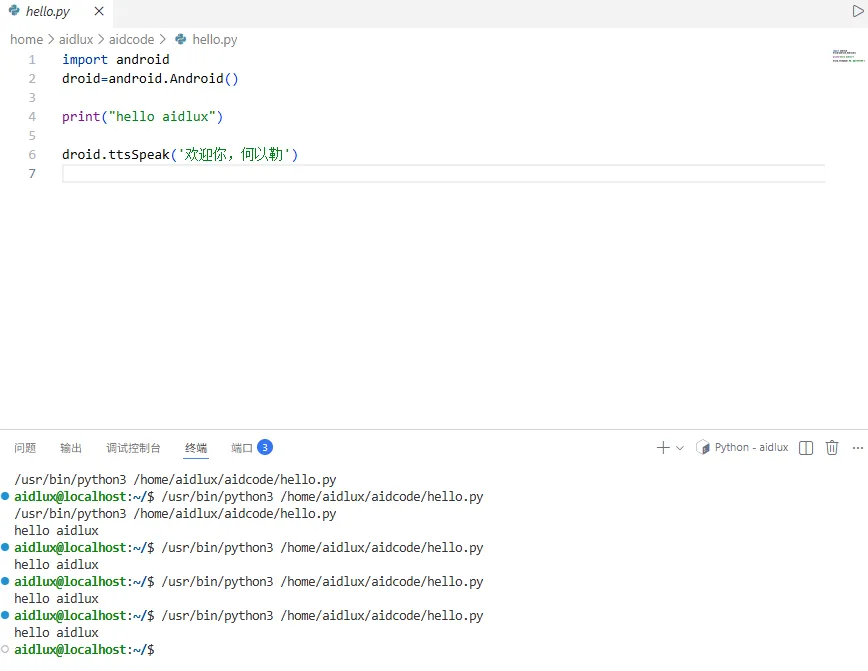 import androiddroid=android.Android()print("hello aidlux")droid.ttsSpeak('欢迎你,何以勒')