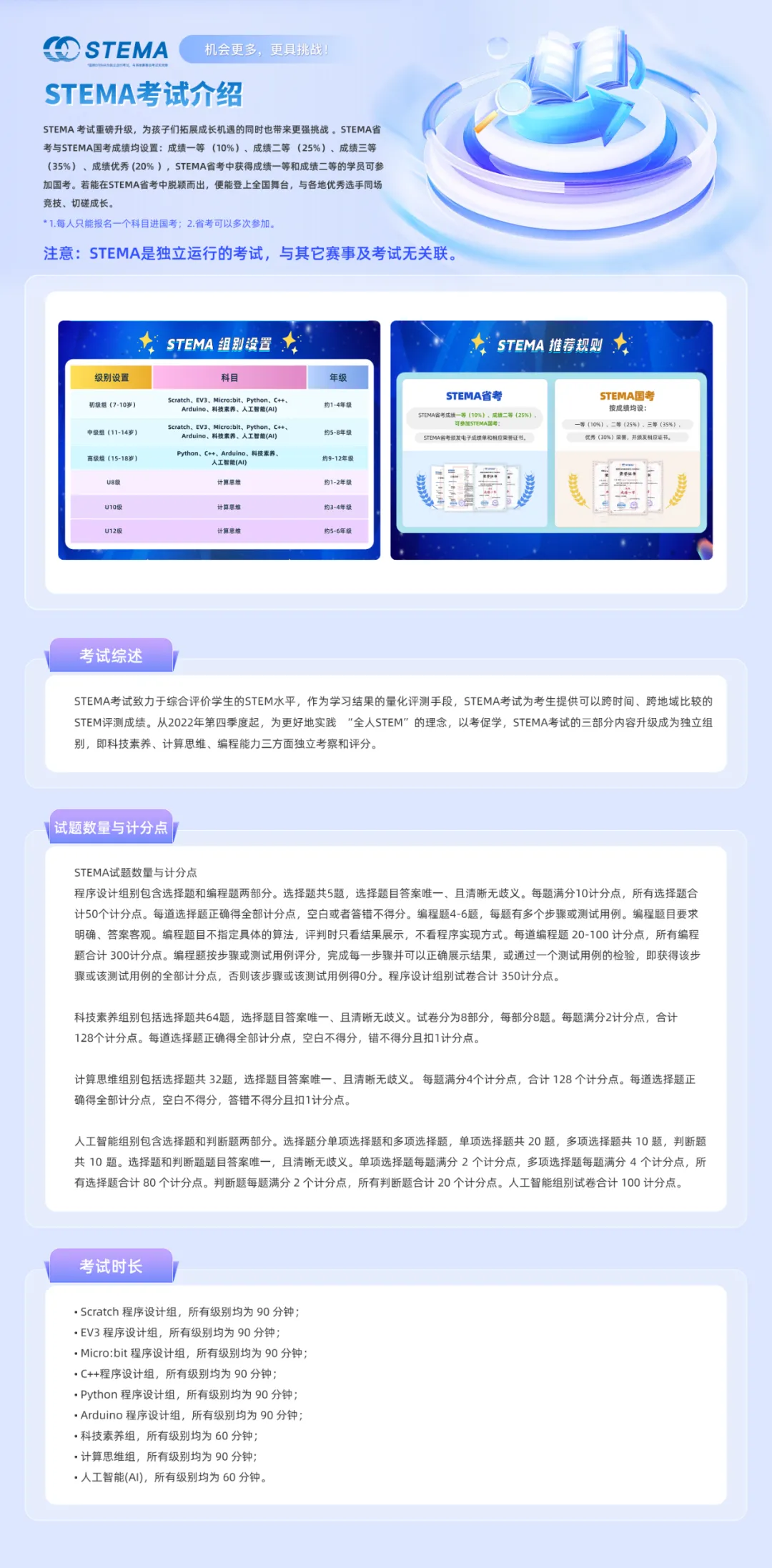 从2022年第四季度起,为更好地实践“全人STEM”的理念,以考促学,平衡科技素养、计算思维及编程创意的比重,促进中小学校及教育培训机构将STEM教育同学生的心理成长、社会情感和认知发展的培养有机地结合起来,STEMA考试的三部分内容升级成为独立组别,从2025年增加人工智能(AI)独立组别,即科技素养、计算思维、人工智能(AI)、编程能力四方面独立考察和评分。同时,为将科学素养普及到更多学员,为拔尖创新人才的发现、培养提供基础性平台,STEMA设置两级考试:分为STEMA省考、STEMA国考。