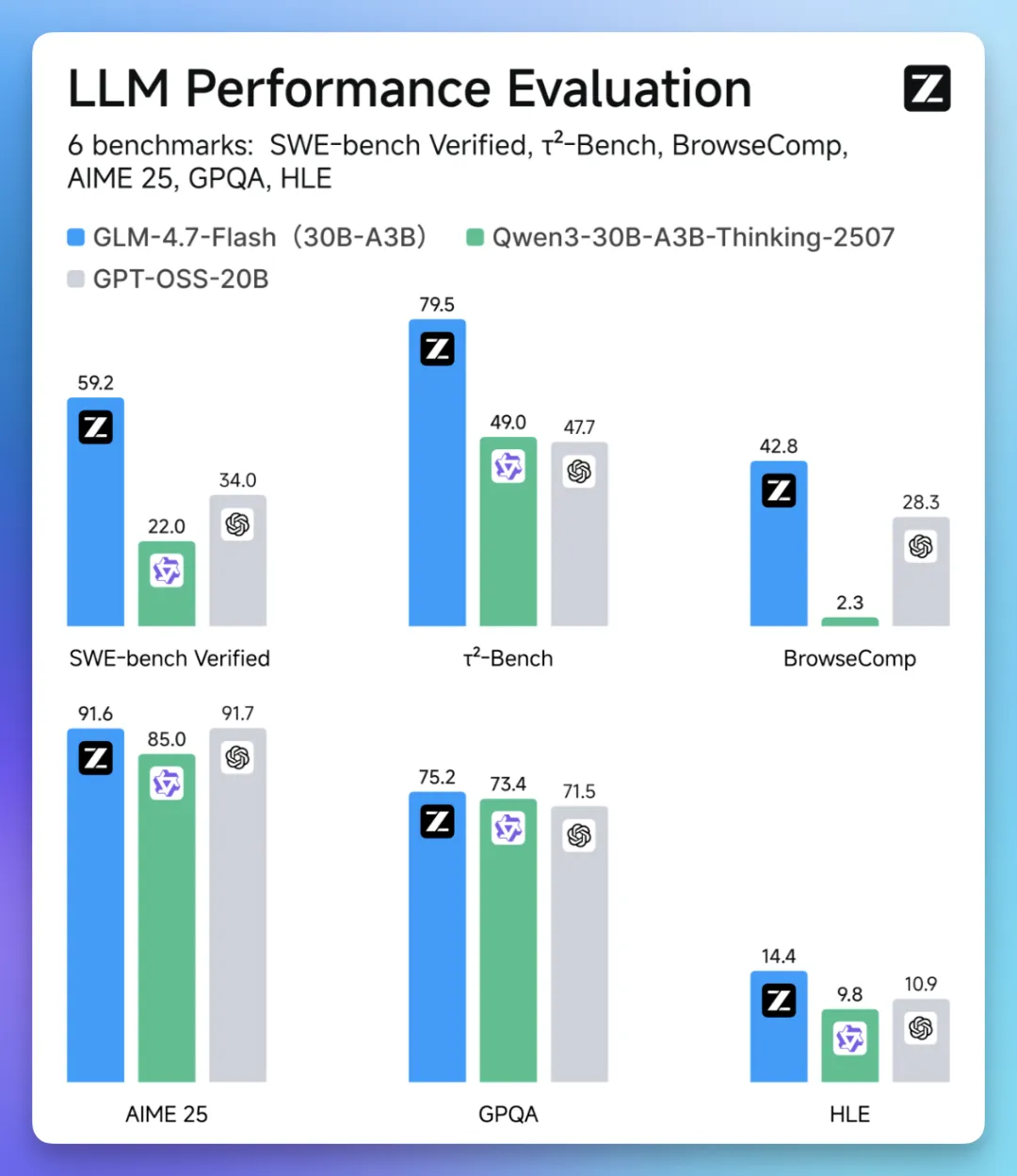 2️⃣ ⚡ 智谱开源 GLM-4.7-Flash :30B 参数混合思考模型,激活仅 3B,比上代快 40%,SWE-bench 得分 59.2 超越 gpt-oss-20b,32GB Mac 可本地运行。
