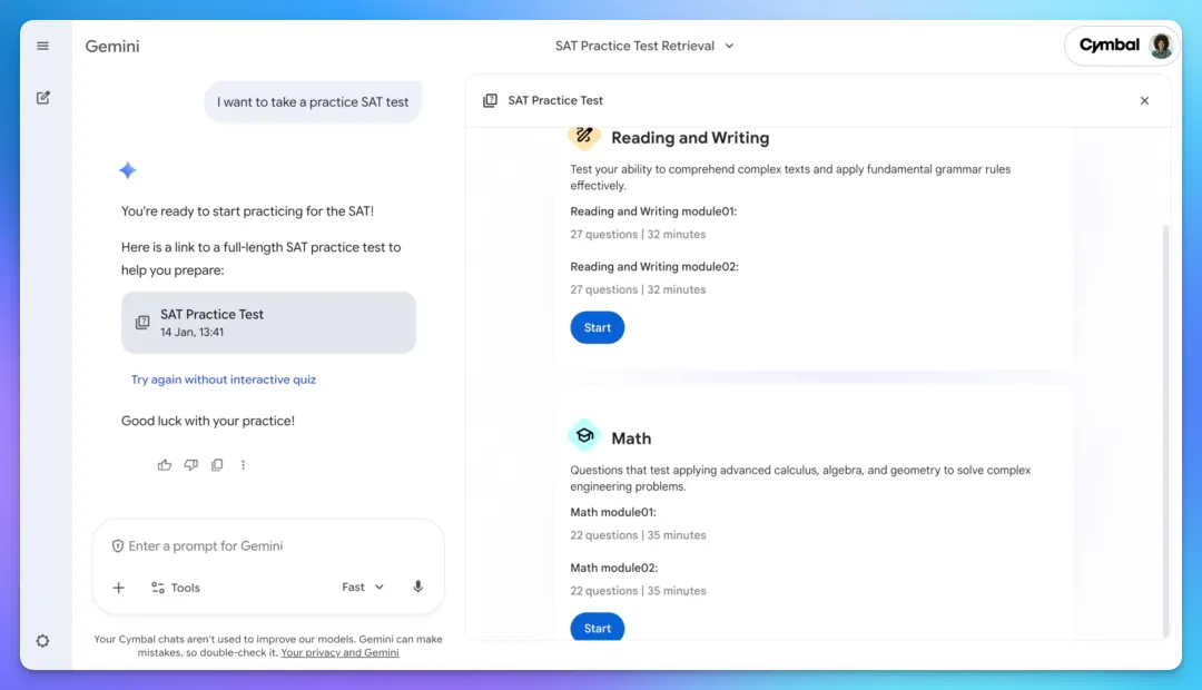 9️⃣ 📚 Gemini 上线免费 SAT 模考 :与普林斯顿评论合作提供题库,模拟自适应格式含计时分节,完成后即时评分并生成个性化学习计划。