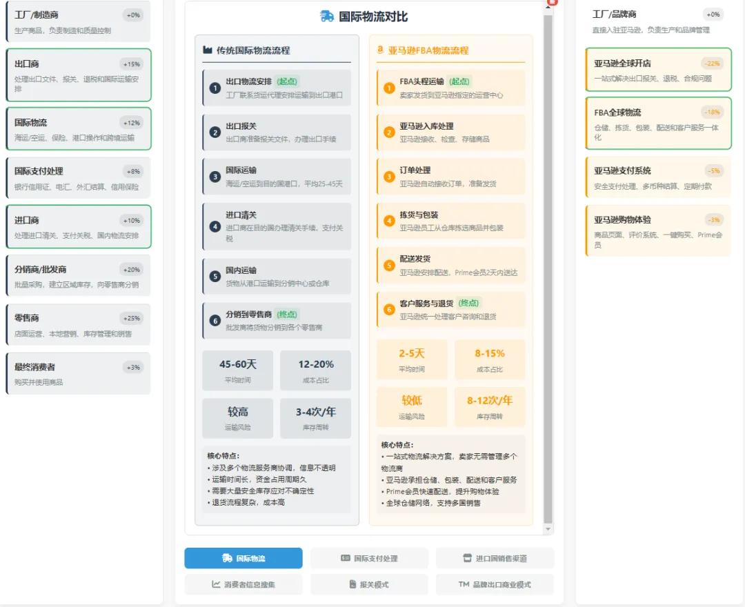 在DeepsSeek程序页面上点击下载,以HTML格式下载程序,点击运行程序,并提出修改意见。第一个网页版本呈现出来以后,亚马逊流程中发现少了制造商这个非常重要的交易主体,我认为贸易的主体应该是不变的,就是贸易商或者制造商,页面呈现后,我发现传统贸易流程缺少支付环节,另外无论是传统贸易还是亚马逊模式需要增加物流和资金流没有呈现出来,亚马逊模式也缺少了工厂和制造商的图标。所以需要调整,要求DeepsSeek重新调整程序。