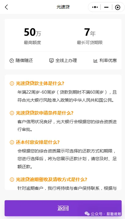 一、申请阶段高频错误代码 1. S001/S002(系统繁忙/版本过低)原因: 工作日9:00-11:00/14:00-16:00重试; 指导客户在“光大银行APP-权限管理”中开启数据共享。 1. 预审工具应用:使用光大官方“征信模拟评分”功能(手机银行-贷款-预评估),提前预测通过率; 对评分<70分的暂缓申请,先优化自身资质。 免责声明:产品信息来源于机构官网/网点/客户经理,或第三方公开信息平台,最终以产品机构发布为准,如产品信息有误或其他异议,可在该页面下方留言