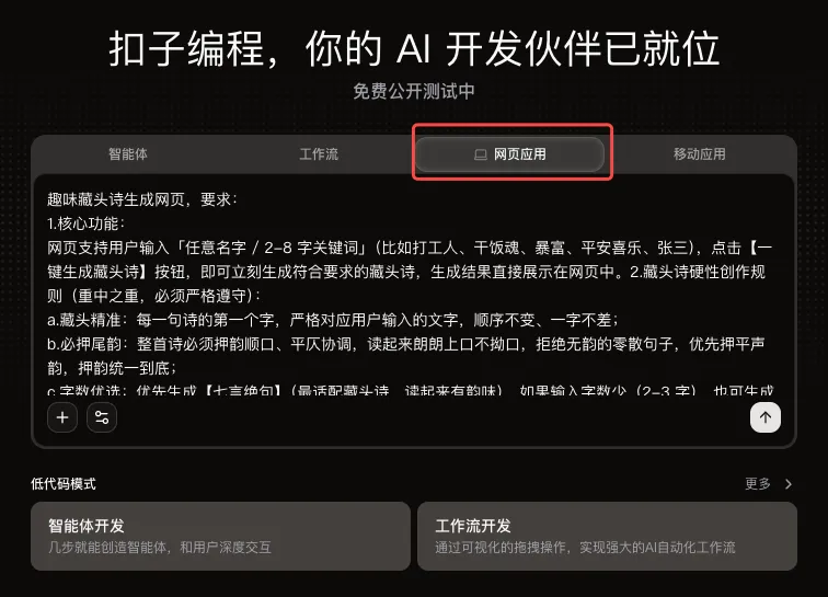 用自然语言输入需求,在这里我想让扣子帮我生成一个趣味藏头诗网页——用户输入关键词,网页就能自动生成押韵又有趣的藏头诗。
