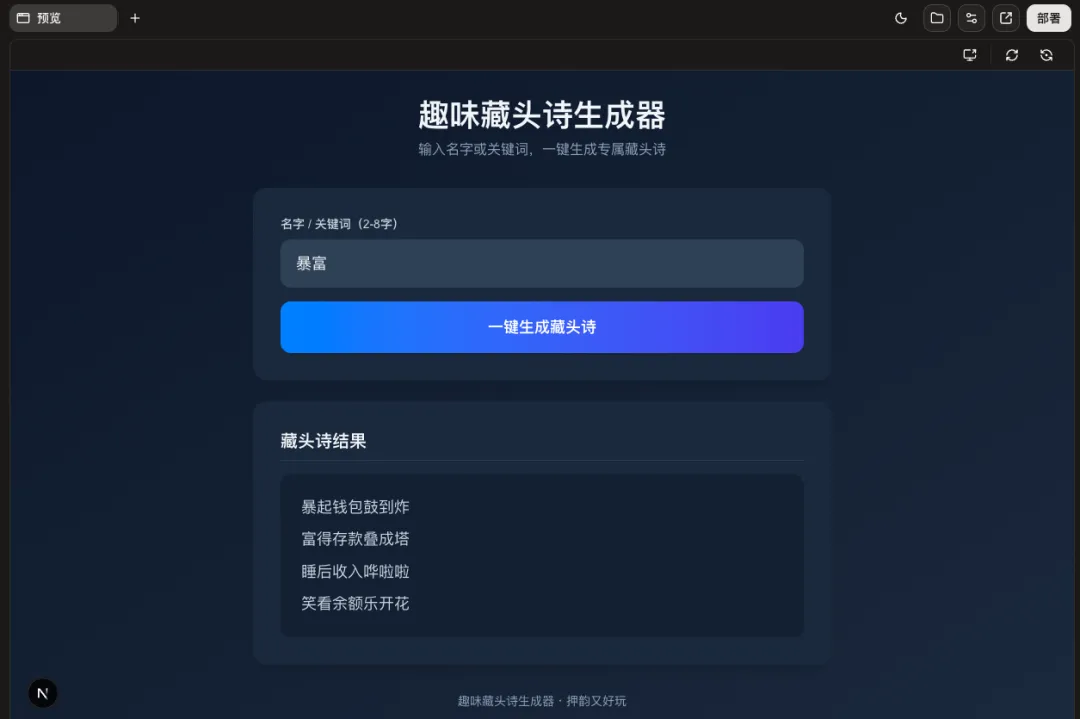 趣味藏头诗生成网页,要求:1.核心功能:网页支持用户输入「任意名字 / 2-8 字关键词」(比如打工人、干饭魂、暴富、平安喜乐、张三),点击【一键生成藏头诗】按钮,即可立刻生成符合要求的藏头诗,生成结果直接展示在网页中。2.藏头诗硬性创作规则(重中之重,必须严格遵守):a.藏头精准:每一句诗的第一个字,严格对应用户输入的文字,顺序不变、一字不差;b.必押尾韵:整首诗必须押韵顺口、平仄协调,读起来朗朗上口不拗口,拒绝无韵的零散句子,优先押平声韵,押韵统一到底;c.字数优选:优先生成【七言绝句】(最适配藏头诗、读起来有韵味),如果输入字数少(2-3 字),也可生成五言,均保证对仗工整;d.趣味适配:如果输入的是网络趣味关键词(如打工人、干饭魂、摸鱼、搞钱、暴富),诗句内容贴合关键词的趣味语境,接地气、有共鸣、搞笑不生硬;如果输入的是名字 / 文雅关键词(如平安喜乐、星辰大海、人名),诗句内容寓意美好、文雅大气、积极向上;e.无生僻字:全诗只用常见汉字,通俗易懂,任何人都能看懂读顺,拒绝堆砌晦涩生僻字。3.网页要求:a.界面设计:页面简洁美观、清爽大方,重点突出输入框和生成按钮,生成的藏头诗结果区域排版工整、字号适中、分行展示诗句,视觉舒适; b.交互体验:添加友好的交互提示,比如「输入为空时点击按钮会提示『请输入名字 / 关键词』」、「生成中短暂提示『正在为你作诗』」,无报错、无卡顿,点击按钮秒出结果; c.响应式适配:网页自适应电脑、手机、平板等所有设备,手机端打开无排版错乱,输入框和按钮适配屏幕大小。4.额外优化:生成的藏头诗,每一句单独成行展示,诗句结尾无需加标点,整体排版整齐;网页自带浅色系背景,无刺眼配色,文字为深色,阅读体验极佳;可在网页底部加一句趣味小标语(如「趣味藏头诗生成器・押韵又好玩」),不占主要版面。