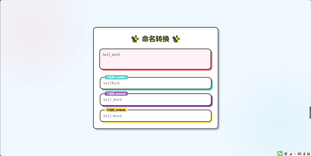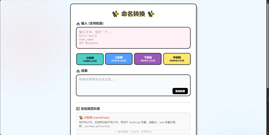 运行生成后的内容,可以看到输入的内容全部显示了对应的格式。调整转换格式的选择,并增了批量转换、驼峰命名的科普介绍。感兴趣的小伙伴,可以动起手来,制作属于自己的工具。