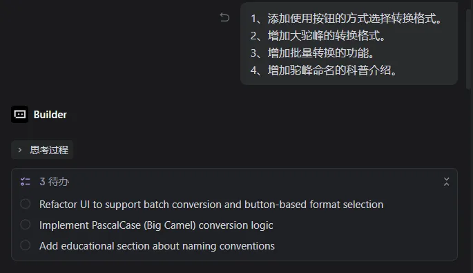 使用 AI 制作一个编程变量格式命名的转换,支持驼峰/下划线/中划线格式的转换。打开 Trae 工具,在对话框中输入开发需求,可以参考下述示例:为我开发一个划线命名转换,具体要求如下: 1. 使用 HTML5 实现,所有功能代码必须整合在单个 HTML 文件中 2. 实现文本划线命名转换功能: - 支持文本驼峰/下划线/中划线命名转换。 - 支持实时显示转换后的内容。 |