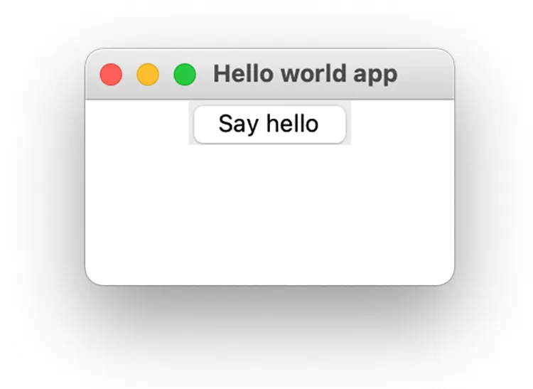 import tkinterfrom tkinter import ttkwindow = tkinter.Tk()window.title('Hello world app')window.geometry('200x100')def say_hello(): print('Hello there!')hello_button = ttk.Button(window, text='Say hello', command=say_hello)hello_button.pack()window.mainloop()
