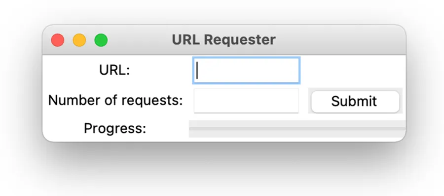 首先,让我们介绍一下我们的应用并草拟一个基本的用户界面。我们将构建一个 URL 压力测试应用。该应用将接受一个 URL 和多个请求作为输入。当我们按下提交按钮时,我们将使用 aiohttp 以最快的速度发送网络请求,向我们选择的网页服务器施加预定义的负载。由于这可能需要很长时间,我们将添加一个进度条来可视化测试的进度。我们将每完成 1% 的总请求数就更新一次进度条,以显示进度。此外,我们允许用户取消请求。我们的用户界面将包含几个小部件,包括用于测试的 URL 文本输入、用于我们希望发出的请求数量的文本输入、一个开始按钮和一个进度条。我们将设计一个如图 7.4 所示的用户界面。