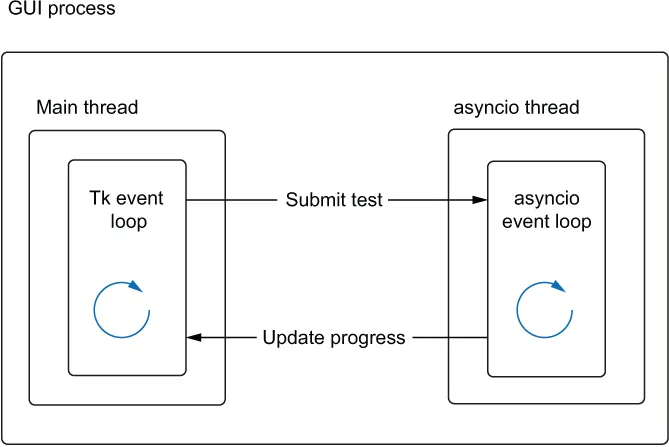 现在我们已经勾勒出了用户界面,我们需要思考如何让两个事件循环同时运行。基本的想法是,我们将在主线程中运行 Tkinter 事件循环,并在独立线程中运行 asyncio 事件循环。然后,当用户点击“提交”时,我们将一个协程提交给 asyncio 事件循环来运行压力测试。在压力测试运行期间,我们将从 asyncio 事件循环向 Tkinter 事件循环发送命令,以更新我们的进度。这为我们提供了一个如图 7.5 所示的架构。