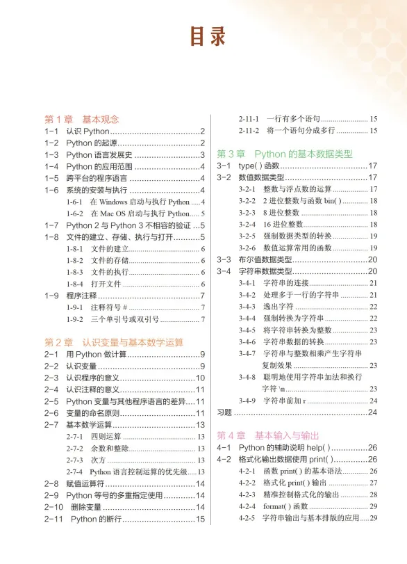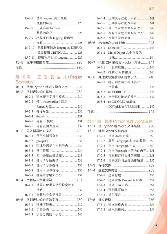 - 前 16 章:夯实基础底座(近 300 页):从变量、数据类型、流程控制,到列表 / 元组 / 字典 / 集合四大数据结构,再到函数、类、模块、异常处理、正则表达式,把 Python 程序员必备的通用知识讲透,是稳扎稳打的基础功训练。